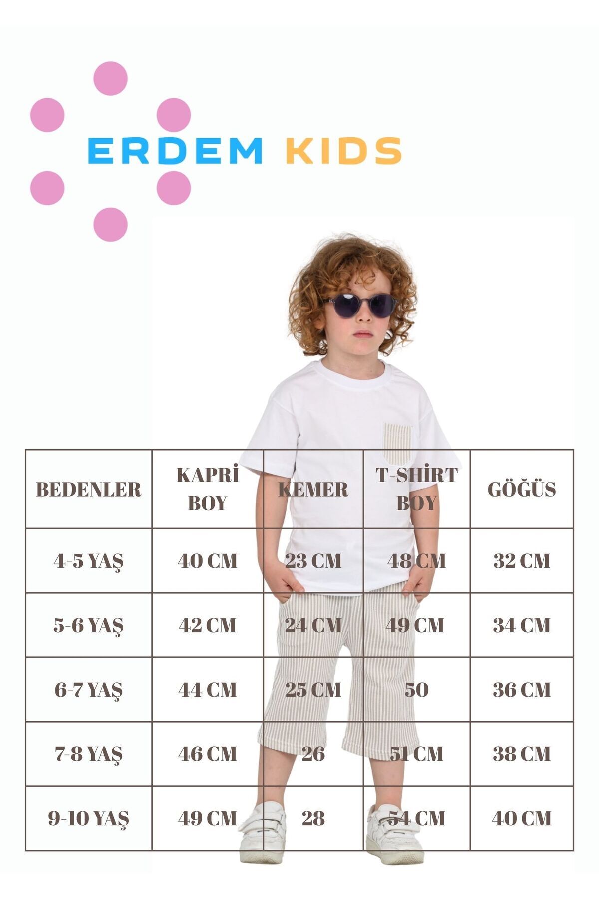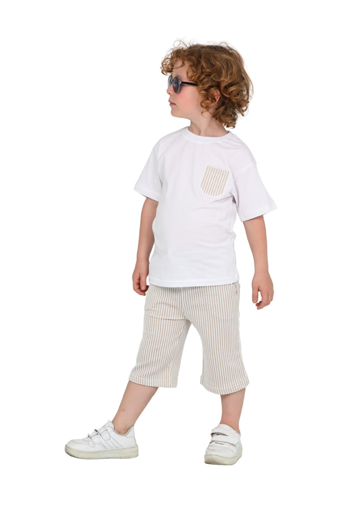 Erkek Çocuk Basic T-shirt Şort Çizgili Kaprili Yazlık 2'li Takım Bej - 9-10 Yaş