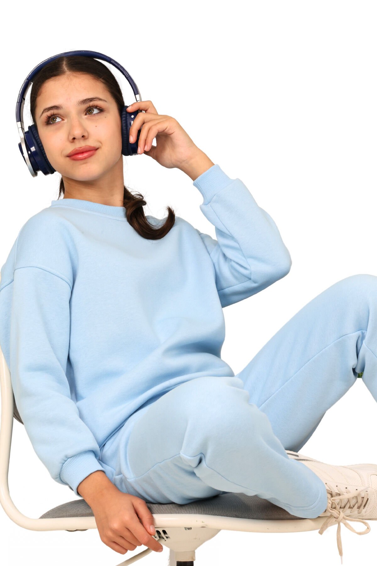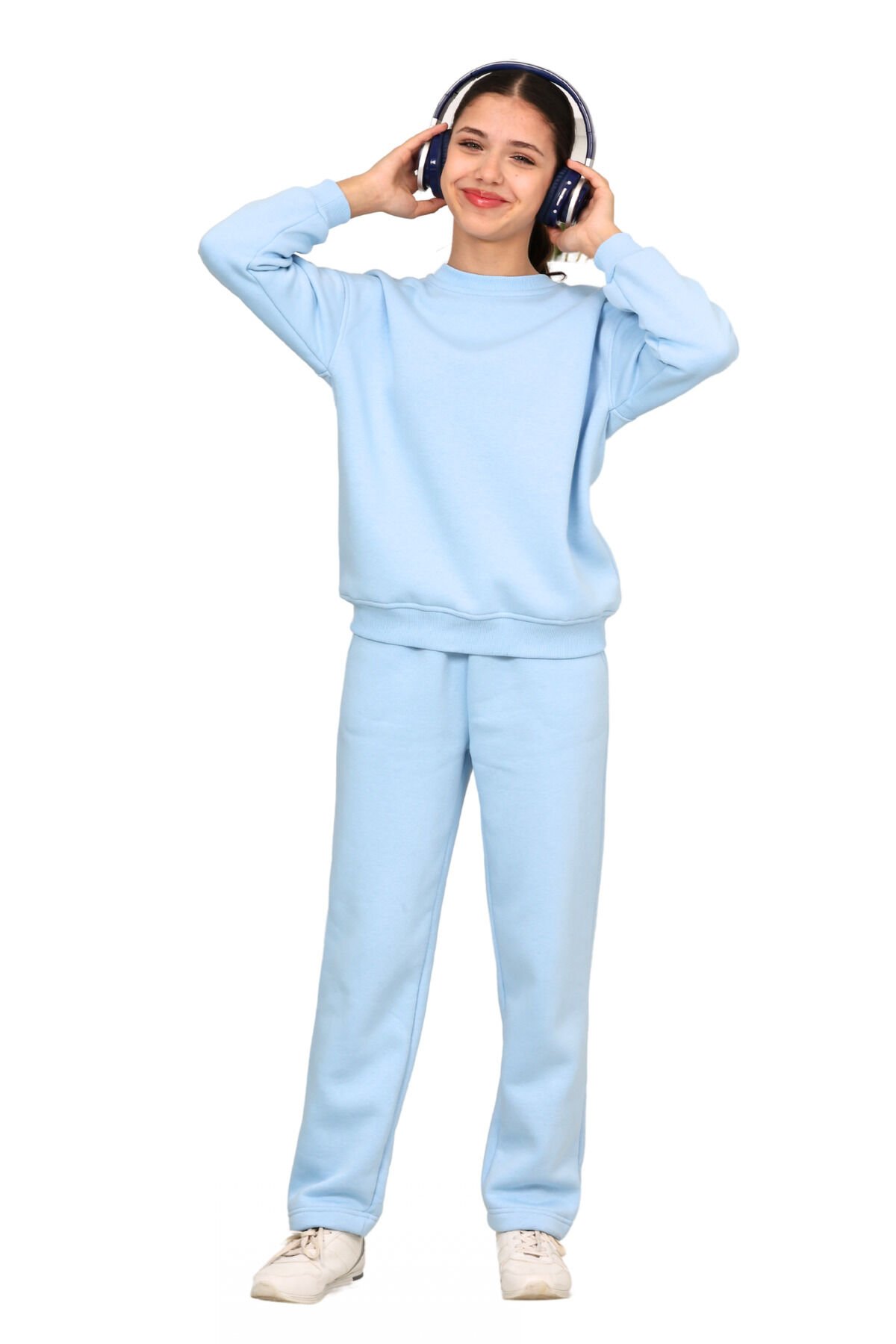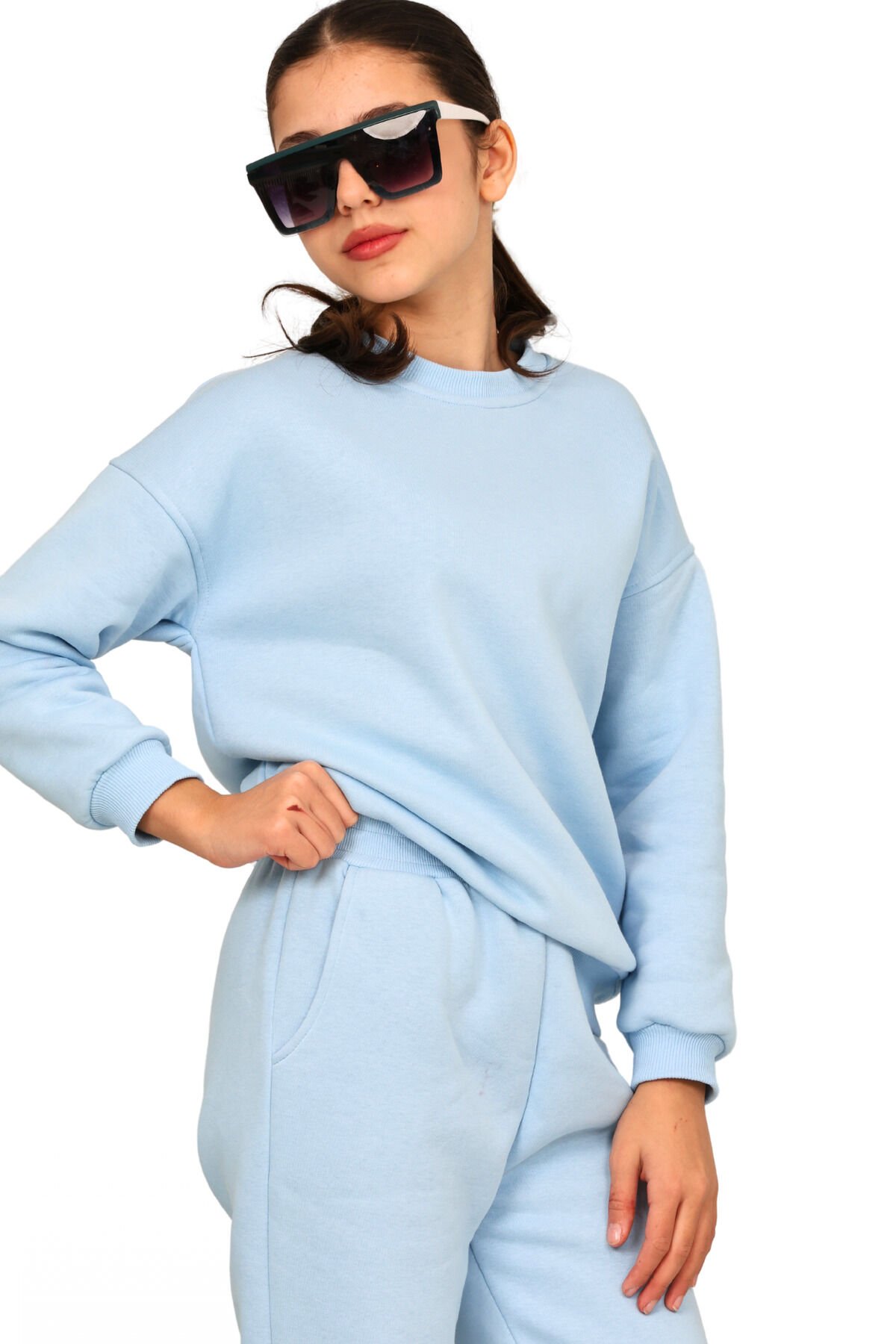 Kız çocuk 3 iplik şardonlu içi pamuklu basic bisiklet yaka eşofman takımı Bebe mavisi - 7-8 Yaş