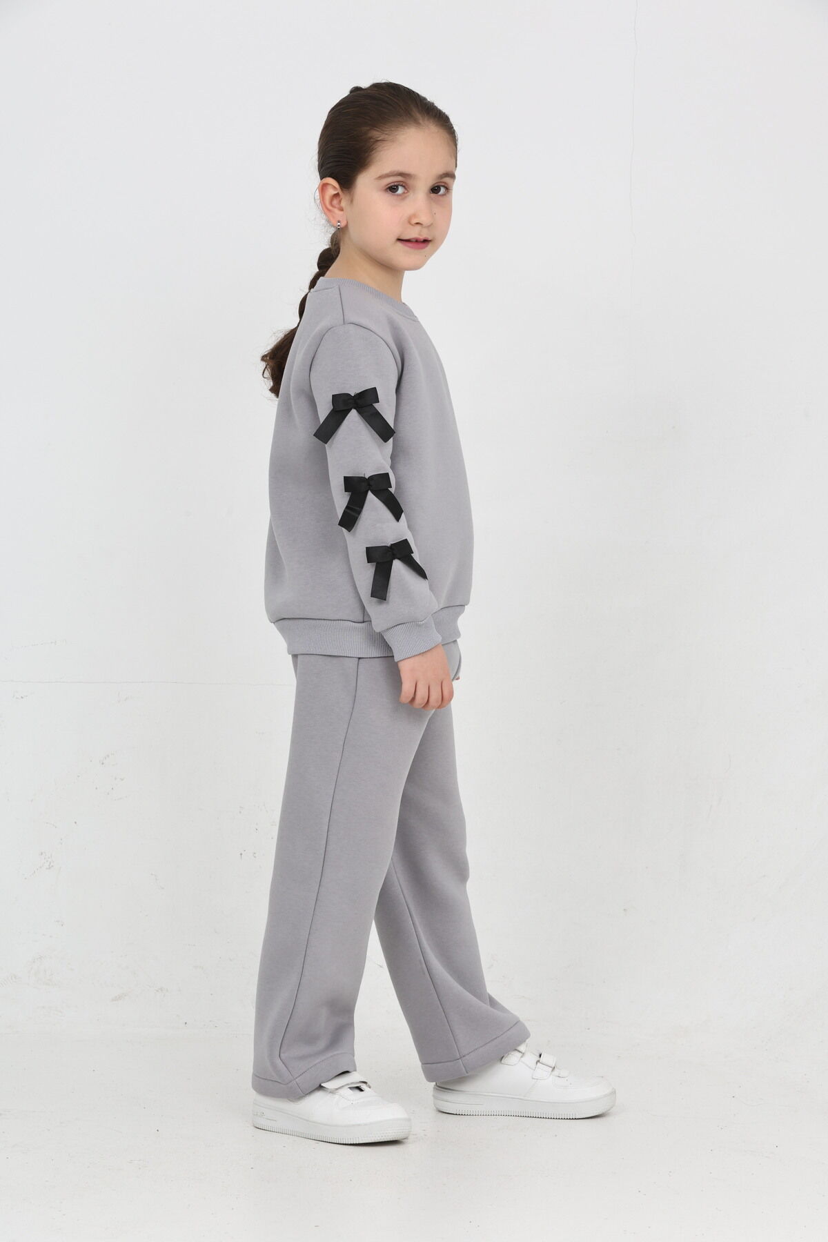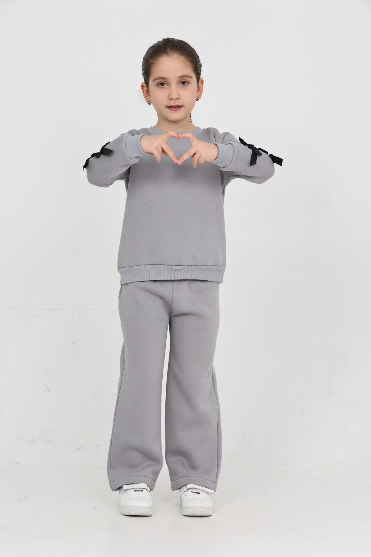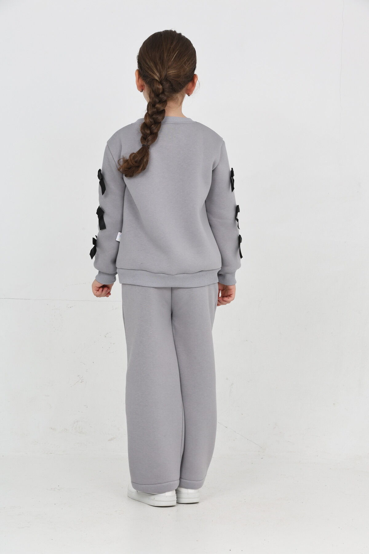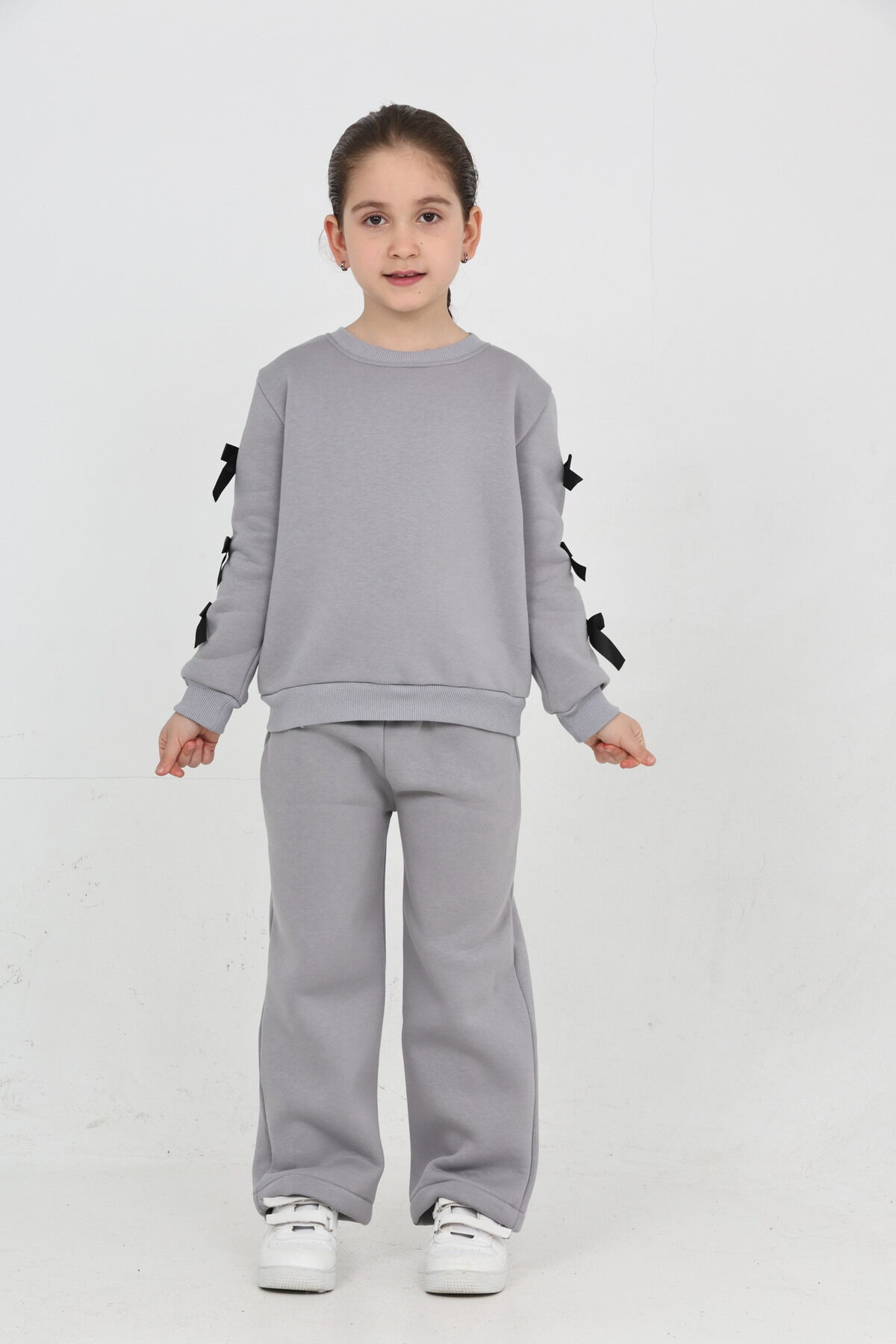 Kız Çocuk 3 İplik Şardonlu Kurdele Detaylı Basic Sweatshirt-Bol Kesim Palazzo Eşofman Takım Gri - 5-6 Yaş