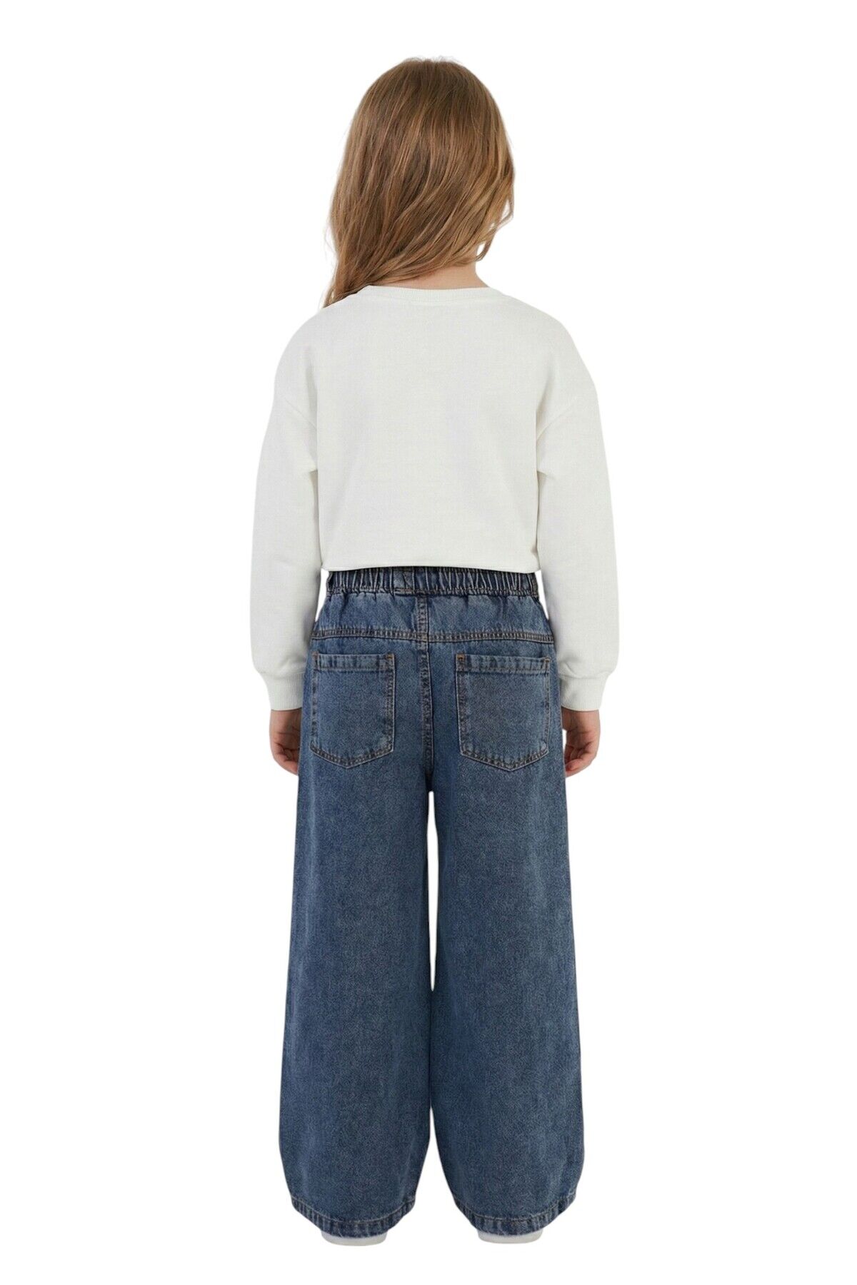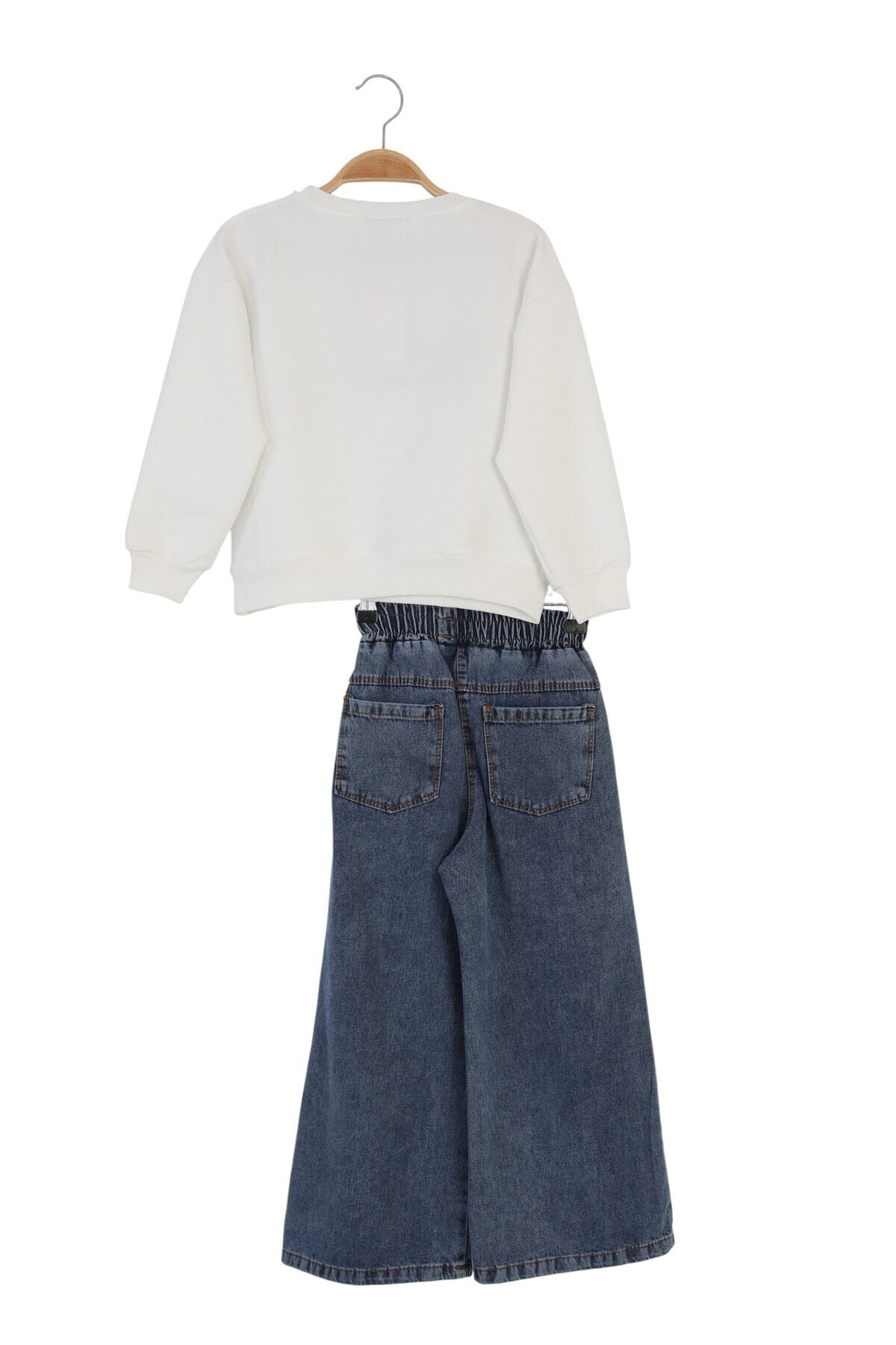 Kız Çocuk Bayramlık Günlük - Casual Geniş-Bol Paça Palazzo Kot Pantolon-Sweatshirt ikili takım Beyaz - Mavi - 5-6 Yaş