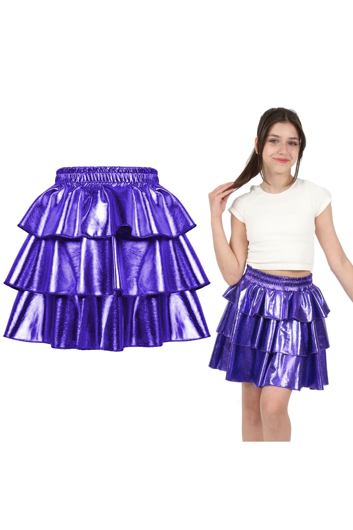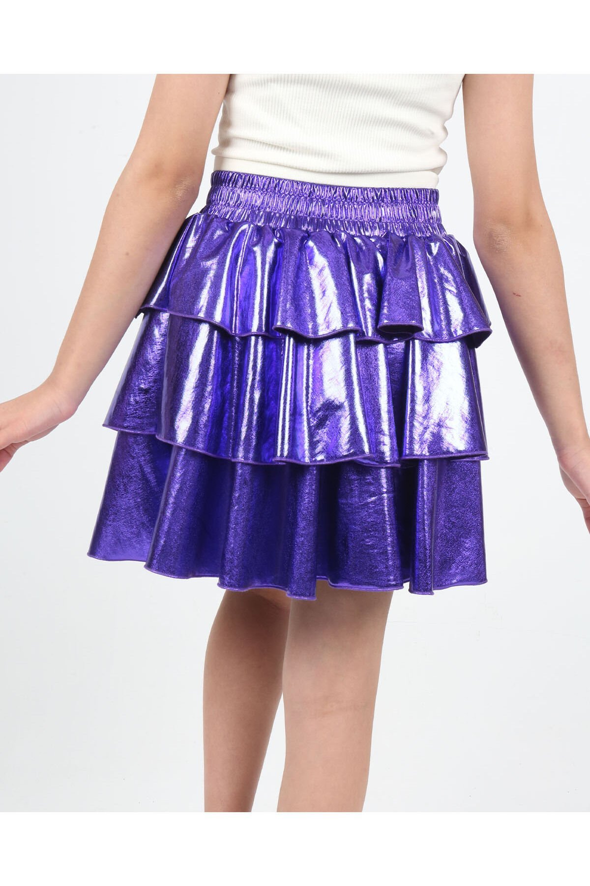 Kız Çocuk Beli Lastikli Metalik Parlak Işıltılı 3 Katlı Fırfırlı Etek Mor - 4-5 Yaş