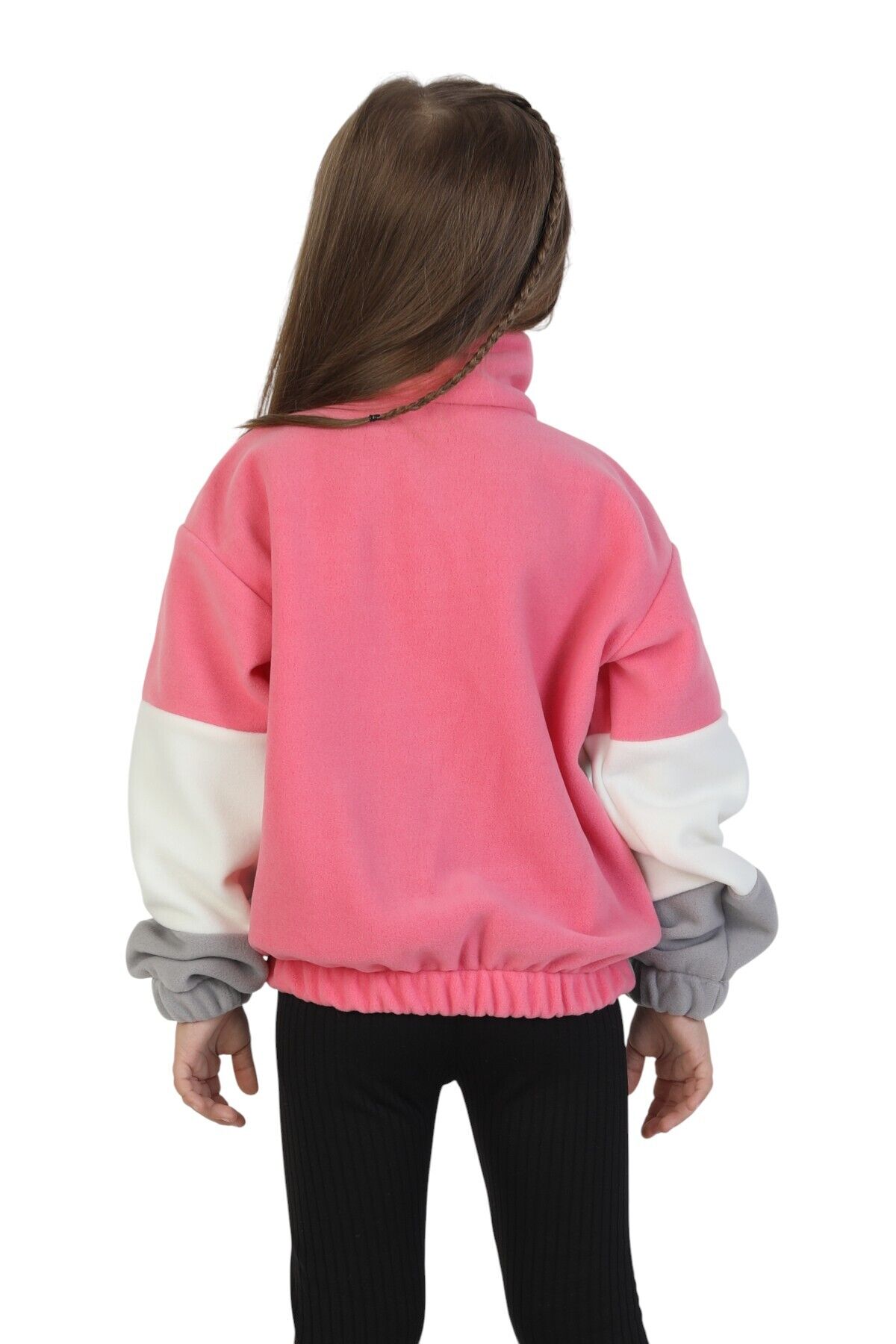 Kız Çocuk Dik Yaka Fermuarlı Sweatshirt-Kazak Beli Lastikli Çok Renkli Kışlık Polar Sweat Pembe-Ekru-Gri - 9-10 Yaş