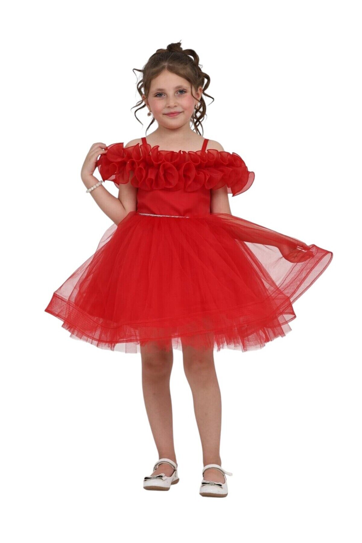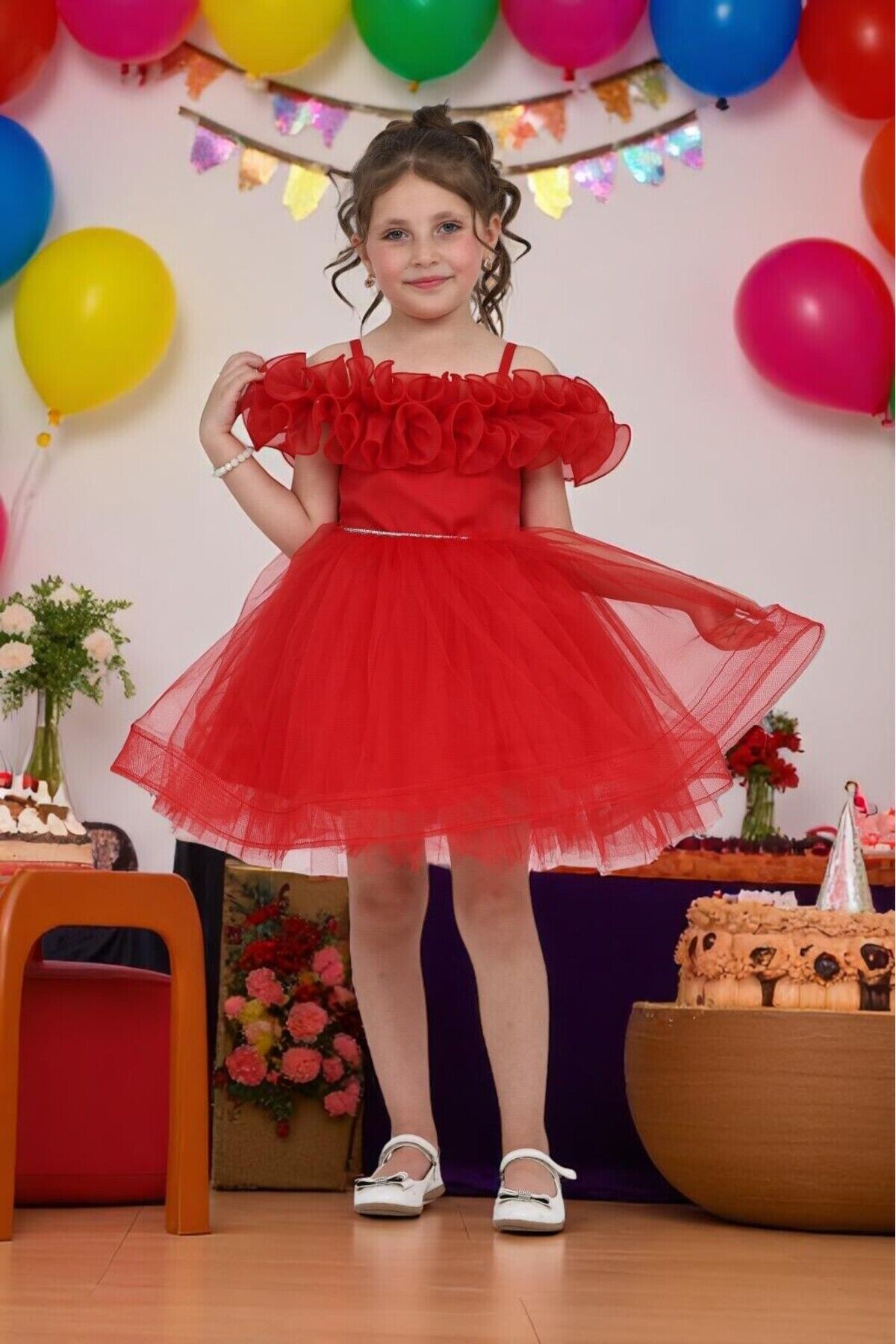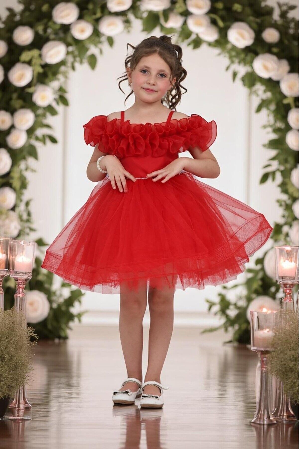 Kız Çocuk Omuzu Askılı Tüllü Düğün Kına Nişan Nikah Doğum Günü Özel Gün Abiye Elbise 1-5 Yaş Kırmızı - 1 Yaş