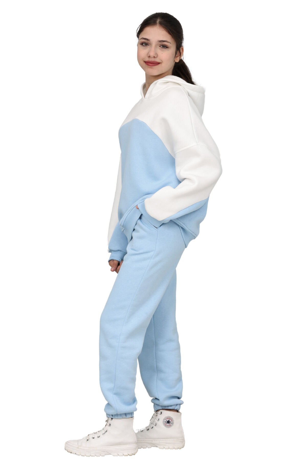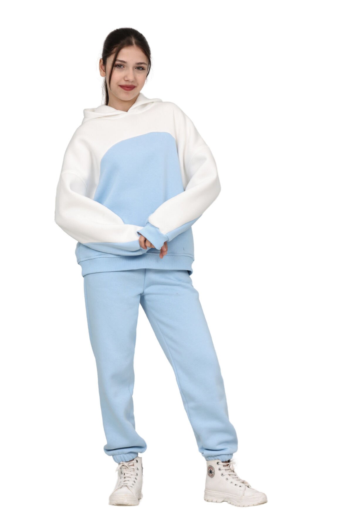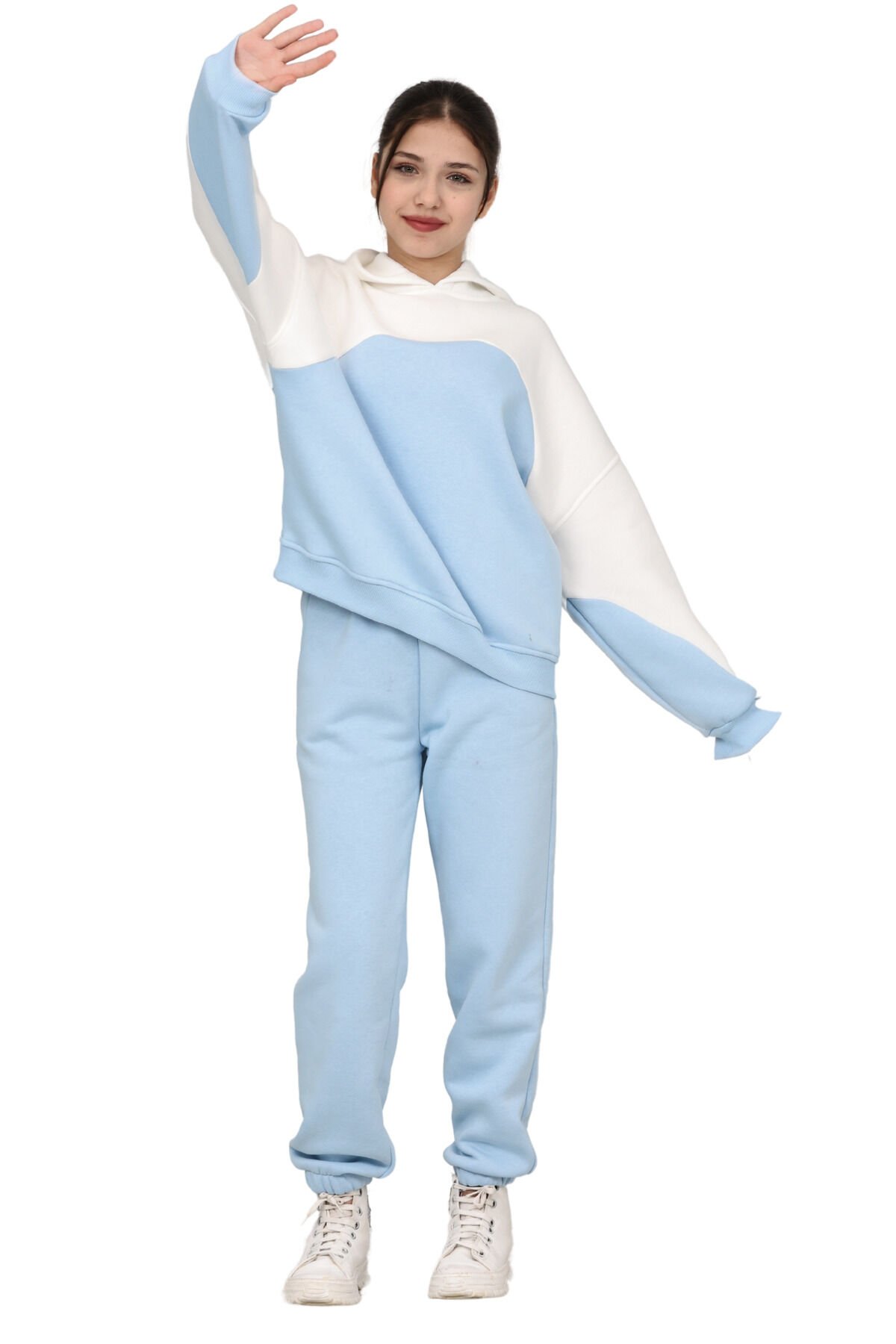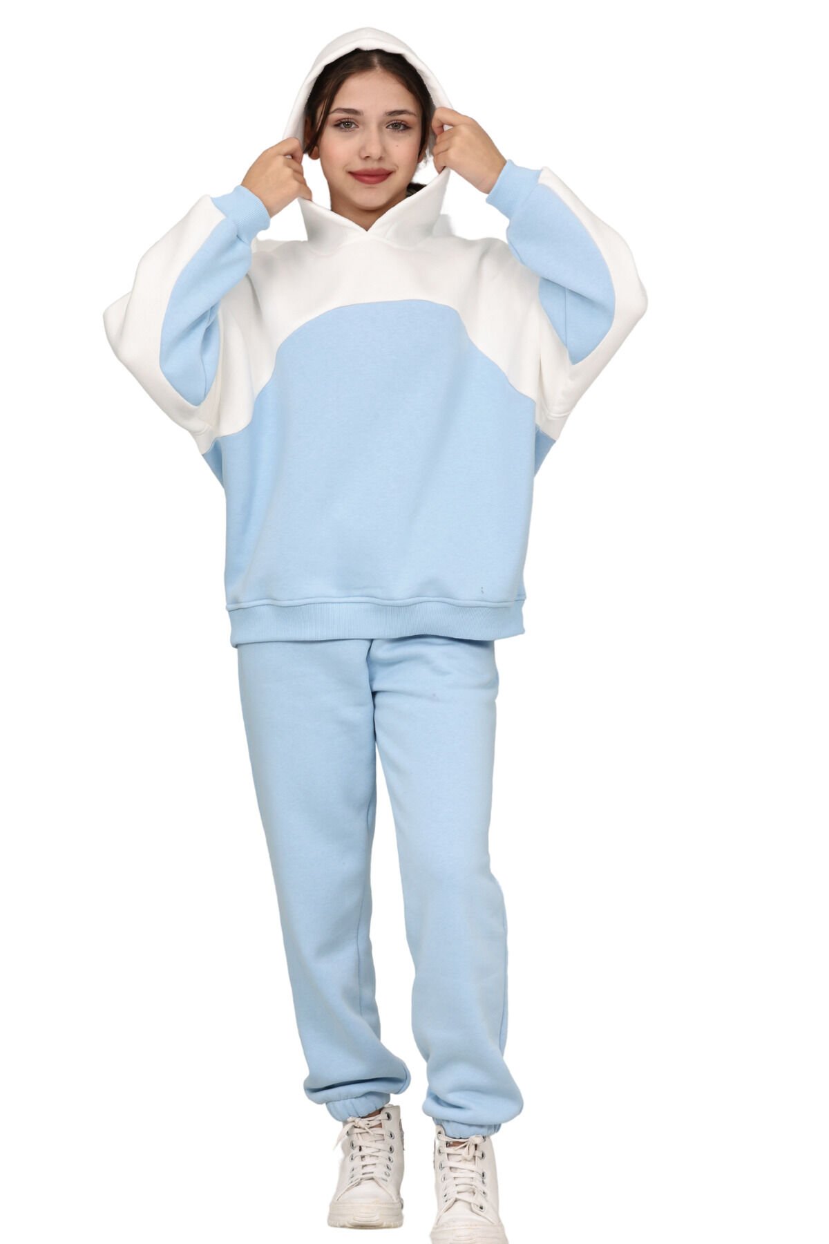 Kız Çocuk Paçası Lastikli, Garnili Oversize 3 I?plik Şardonlu I?çi Pamuklu Eşofman Takımı Bebe mavisi-Ekru - 8-9 Yaş