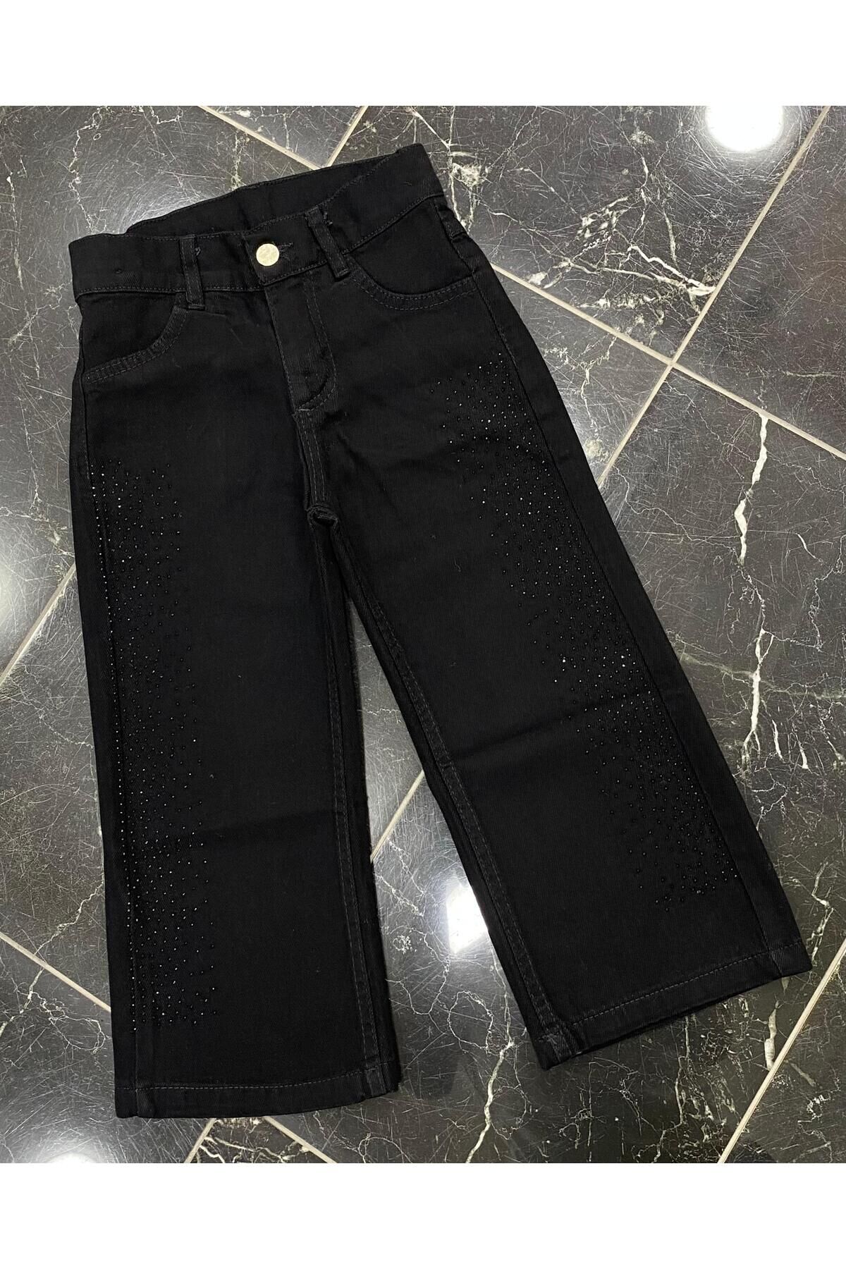 Kız Çocuk Pamuklu Beli Lastikli Jean Pantolon Rahat Kalıp Geniş Bol Paça Taş detaylı Kot Pantolon Siyah - 10-11 Yaş