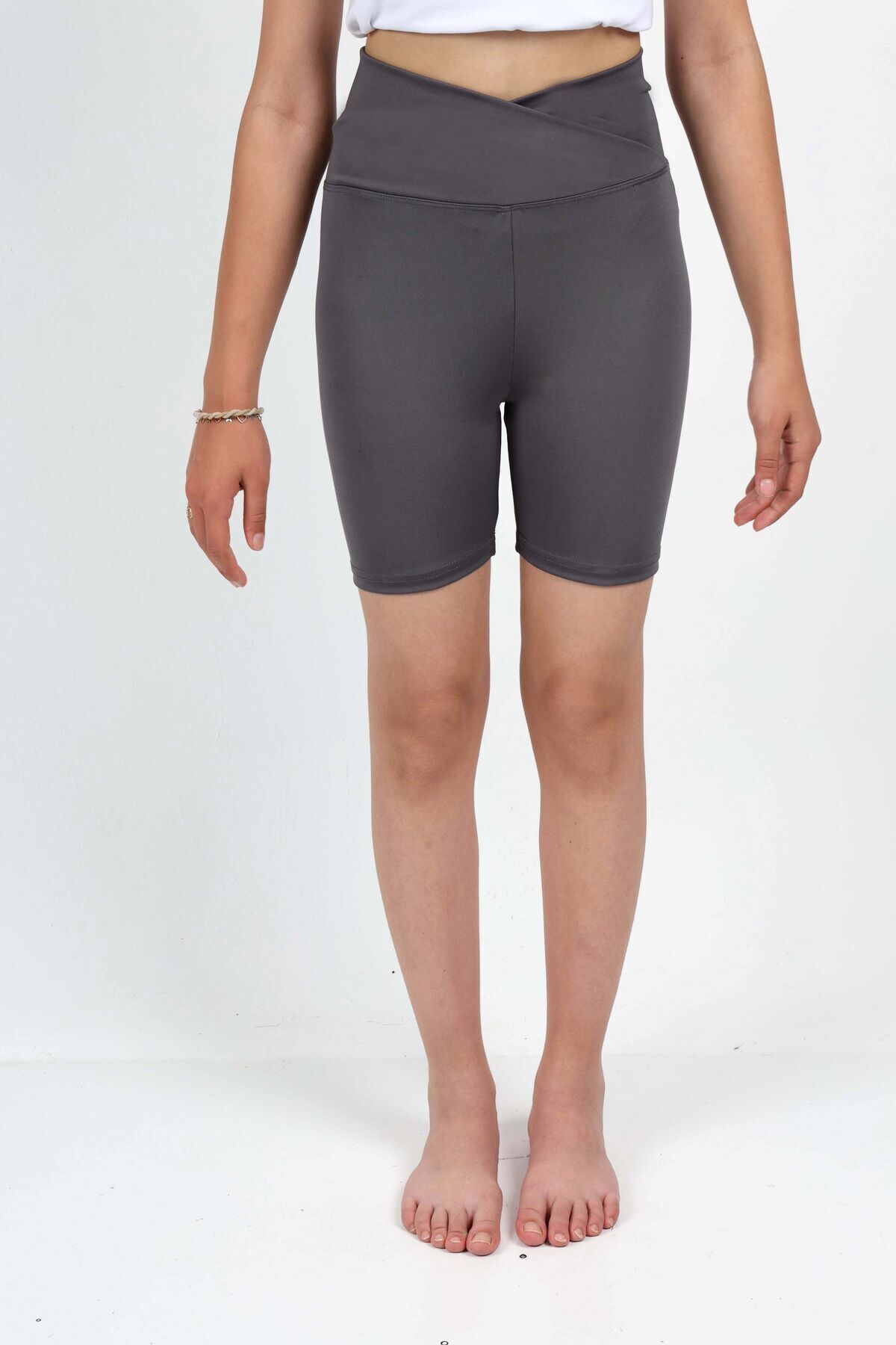 Kız Çocuk Yüksek Kruvaze Bel, Biker, Koşu, Yürüyüş, Spor, Atletik, Egzersiz, Fittness Kısa Tayt Antrasit - 8-9 Yaş