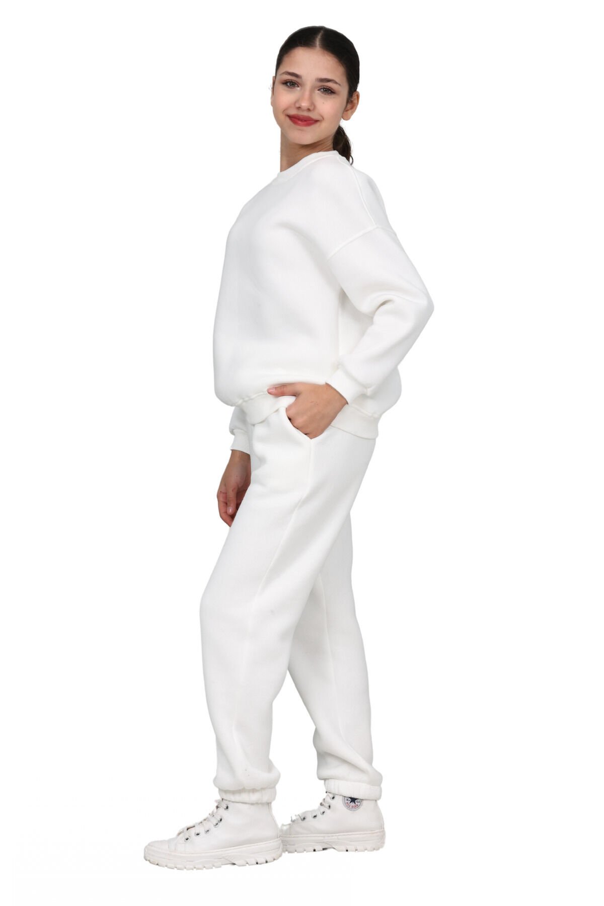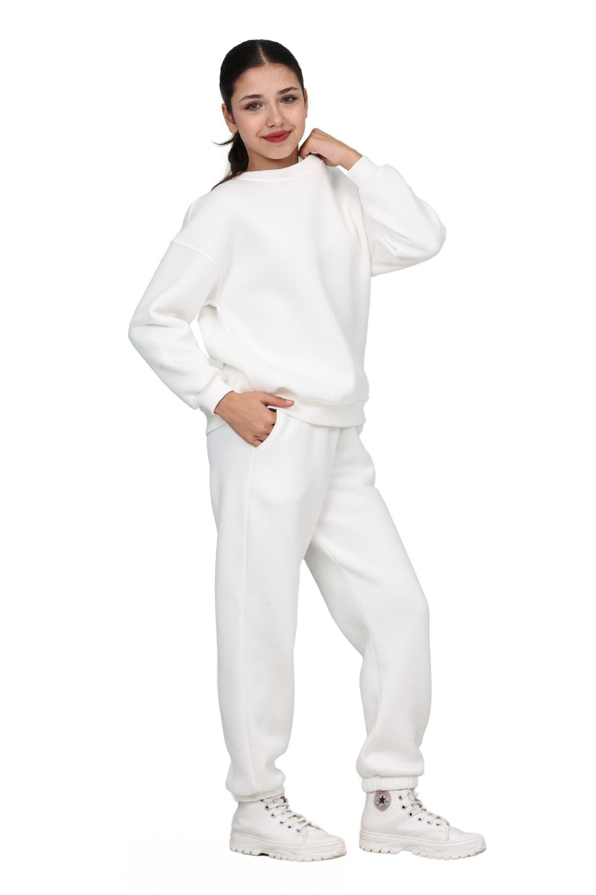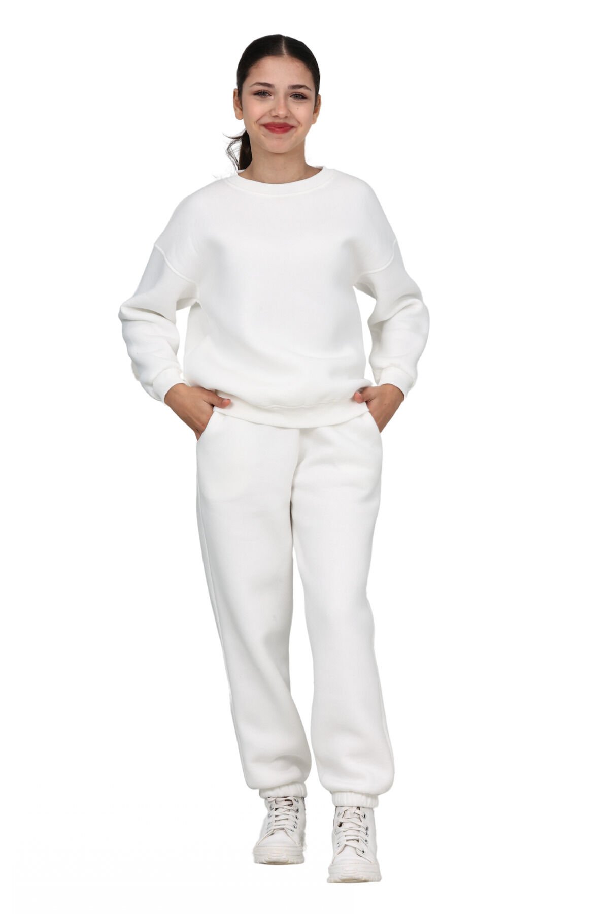 Pamuklu kışlık kumaşdan üretilen bu eşofman takımımız soğuk sonbahar ve kış aylarında çocuklarınızı ısıtmak için birebir.; Modern ve fit tasarımı sayesinde çocuklarınızın üşümemelerine yardımcı olurken aynı zamanda şık ve zarif görünümlerine de ekstra bir dokunuş olacak bu eşofman takımı beş farklı renk (siyah, ekru, gri, bebe mavisi, pembe) ve sekiz farklı beden seçeneğiyle tercihinize sunulmuştur.; Zarafet, şıklık, konfor, sıcaklık hepsi bir arada.; Gerek ev giyiminde gerekse de dış giyimde rahatlıkla tercih edilebilir- Standart boy ve regular kalıp ile rahat bir kullanım sunar.; - Örme kumaş tipi, esneklik ve konfor sağlar.; - 10-11 yaş arası çocuklar için ideal beden seçeneği mevcuttur.; - Unisex tasarımı ile hem kız hem de erkek çocuklar için uygundur.; - Ekru rengi, kolay kombin yapma imkanı sunar ve şık bir görünüm sağlar.; - Normal bel tasarımı ile gün boyu rahat hareket etme olanağı tanır.; - Uzun kol ve paça boyu, mevsim geçişlerinde ideal koruma sağlar.; - Pamuklu materyal cildi tahriş etmeden yumuşak bir dokunuş sunar.; - Regular paça tipi, hareket özgürlüğünü kısıtlamaz.; - Bisiklet yaka tasarımı modern ve spor bir stil yaratır.; - Düz deseniyle sade ve zamansız bir görünüm elde edilir.; - Tekli paket içeriği pratik kullanım için idealdir.; - Çift cepli tasarım küçük eşyalar için ekstra alan sunar.; - Kapamasız yapısıyla kolay giyip çıkarma imkanı sağlar.; - Uzun kol ve paça boyu soğuk havalarda ekstra koruma sağlar.; - Cep detayları fonksiyonellik kazandırırken şıklığı da beraberinde getirir.; - Basic koleksiyonun parçası olarak günlük kullanım için mükemmel seçimdir.; - Cool & Comfort Persona ile rahatlığı ve stili bir arada yaşatır.; - Basic silueti sayesinde her tür alt giyimle uyum sağlar.; - Günlük ortamlarda rahatlıkla tercih edilebilir.; - Baskısız yapısıyla sade ve şık duruşunu korur.; - 3 iplik penye şardonlu dokuma tipi dayanıklılık ve konfor sunar.; - Sürdürülebilirlik detayına sahip olması çevre dostu bir tercih olmasını sağlar.; - Ek özellik bulunmamasına rağmen temel ihtiyaçları karşılar.; -%65 polyester ve %35 likra karışımından oluşan materyal esneklik kazandırır.; -Tüm yaş gruplarına hitap eden geniş kullanım yelpazesi sunar.; -Kış sezonunda ideal sıcaklık dengesi sağlar.; -Türkiye menşeli ürünlerle yerli üretim kalitesini destekler.